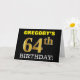 Den här födelsedagskalenderns hälsningskort innehåller ett meddelande som "GREGORY'S 64:e BIRTHDAY!", där "64:e" har ett utseende som liknar guld och liknar färg. Mottagarens namn på framsidan kan anpassas, och bakgrunden är svart på färgad. Det innehåller också ett hälsning-meddelande om personligens födelsedag på insidan. Ett sådant här födelsedagshälsningskort kan kanske ges till någon i firande på deras sextiofjärde födelsedag. [~Z0000183]