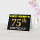 Den här födelsedagskalenderns hälsningskort innehåller ett meddelande som "FÖRST-NAMN's 75:e BIRTHDAY!", där "75:e" har ett utseende som liknar guld och liknar färg. Mottagarens namn i framkanten kan vara personlig, och den främre bakgrunden är färgad svart. Det innehåller också ett hälsning-meddelande om personligens födelsedag på insidan. Ett sådant här födelsedagshälsningskort kan kanske ges till någon i firande på deras sjuttiofemårsdag. [~Z0000183]