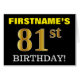 Den här födelsedagshälsningskortet har ett meddelande som "FIRSTNAME's 81:a BIRTHDAY!", där "81:a" har ett utseende som liknar guld och liknar färg. Mottagarens namn i framkanten kan vara personlig, och den främre bakgrunden är färgad svart. Det innehåller också ett hälsning-meddelande från anpassadets födelsedag på insidan. Ett sådant här födelsedagshälsningskort kan kanske ges till någon i firande på deras åttio första födelsedag. [~Z0000183]