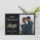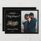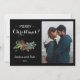 Smutsande, svart julkort anpassat med ditt favoritfoto. Anpassa med namn och året till lämnat. Vackra vattenfärgade helgdag bouquet med gräs boughs, röda bär och pinekonar. Baksidan är fast svart med en annan arrangemang av helgdag, bär och klockor.