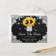 Romantisk personlig Stustik solrosola bröllop spara datum-vykort med solrosbukett inuti en mynning burk mot en svart bakgrund av kritskiva med vit blommigt snöre och sträng ljus. Rustic chalkboard och solros sparar datumet på vykortet.