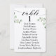 Svävad typsnitt svart kalligrafiskrift mot krispigt vitt papper med gröna eukalyptus kvistar bordskort med sittnamn för tio personer.