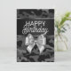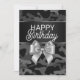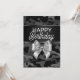 Anpassningsbar födelsedagskort med "Grattis på födelsedagen" i blandad typografi, silver-butik, svart satin-band och svart kamouflage-bakgrund.