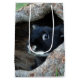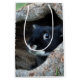 Vita, svarta och vita, som pockar det är ett huvud ut ur en träd.