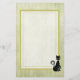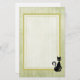 Elegant svart katt som pockar med en tass upphöjd. Har en söt svan och har finare-choker på sig. Bakgrunden är en utmattad åldras som tittar papper i en gulaktig grönt färg. Centrumet har en rektangel med dubblan guld gräns med en genomskinlig vit övertäckning som gör att du kan skriva ditt meddelande inuti.