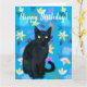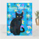 Akvarellmålning av en svart katt, blommor i bakgrunden, Grattis på födelsedagen!