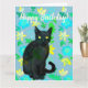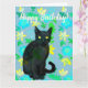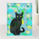 Akvarellmålning av en svart katt, blommor i bakgrunden, Grattis på födelsedagen!