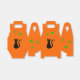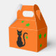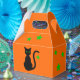 En silhuettetisk tecknad av en svart katt med grönt ögon på orangens bakgrund. En grönt stjärna hänger från kattens svan. Andra stjärnor dekorerar resten av grönten.