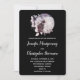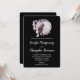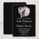 Bröllopsinbjudan med en akvarellmålning av en svart katt och en ljuslila blomsterbukett. Står framför en stor fullmåne. Stilig och magisk. Svart bakgrund.