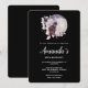 Födelsedagsinbjudan med en vattenfärgsmålning av en svart katt och en benvit blommigt bouquet. Stå framför ett stort fullt måne. Snyggt och magi. Svart bakgrund.