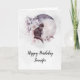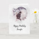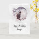 Födelsedagskort med en vattenfärgsmålning av en svart katt och en lätt blommigt för lila och rosa. Stå framför ett stort fullt måne. Snyggt och magi.