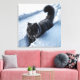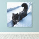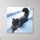 En flytande svart katt med snöflingor på päls går genom ett djupt snövilt väg