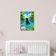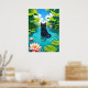Bilden tecknad-stil har en svart katt sitta i en damm omgiven av lila dynor och lotus blommor. Katten har grönt ögon och en slimmad mörk jackar. Vatten är en pulserande turkos, med krämer som kommer från kattens plats. Stora, grönt lily-dynor flyter på vatten yta, och rosa lotus-blommor tillsätter poppar från färg.