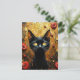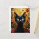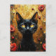 En söt svart katt med stora gula ögon och röda rosor på en guldbrown marmorerad bakgrund