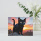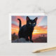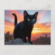 En slående vykort med en svart katt silhuett mot en varm, lysande solnedgångshimmel. Perfekt för kattälskare, samlare och alla som uppskattar magisk, minimalistisk eller naturinspirerad konst. Idealisk för att skicka, ge bort, journalföring eller visning.