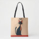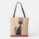 En katt av svart och röd tecknad, i ett modernt stil i mitten av århundradet, som sitter på en röd hylla eller golv, mot en peachisk bakgrund, skapar en charmerande väska. Perfekt för alla som kärlek katter.
