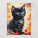 Denna akrylmålning visar en söt svart kattunge utomhus under höstsäsongen, omgiven av röda, orange och gula löv. En höstkärnlig porträtt av en bedårande katt perfekt för hösten eller egentligen när som helst! För fans av svarta katter, kattungar i allmänhet och höstsäsongen.