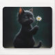 En liten svart kattunge sitter, som varsamt håller en vit daisy i tassar, med en lugn och ett nyfiket uttryck