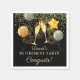 En Pension-party-cocktail-napkin med champagneglas, ballonger och guld glitter, guld på svart.
