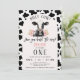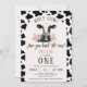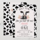 Black Cow Print Rosa Arch Heliga Cow 1:a födelsedagsinbjudan Sötkomattema första födelsedagsinbjudan med en ljus rosa båge och svart kompress mönster, svart och vit ko, några rosa blommor och en komklocka. Den här heligan är en första födelsedagsinbjudan som är perfekt för någon som tittar en inbjudan till en svart och vit ko-födelsedag.