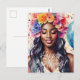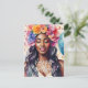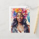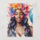 Denna färgglada vykort har en vacker, leende svart kvinna som bär en blomsterkrans, omgiven av konfetti. En blå ballong och orden 'Grattis på födelsedagen' knyter ihop allt i en festlig födelsedags hälsning! Fira den magiska melanerade födelsedagsflickan i ditt liv med detta flerfärgade festvykort.