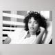 Ett svart och vitt foto av en svart kvinna sitta i en snyggt, ett modernt kass som lutar hennes huvud mot hennes hand. Skapad med generativa algoritmer och Photoshop.