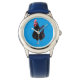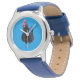 På en svampad blå bakgrund visas en söt svart kyckling som går framåt