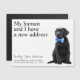 Min människa och jag har en Ny adress! Låt din bästa vän meddela din rörelse med detta söta och roliga reklamkort för flytta av sällskapsdjur. Anpassa namn från hund eller katten, och din ny adress. Detta svarta meddelande om flytta på arbetsmarknaden och hund är ett måste för alla älskare och hundälskare på arbetsmarknaden. COPYRIGHT © 2020 Judy Burrows, Black Hund Art - Med alla Höger reserverade. Svart lab aviseringskort för Ny adress Hund Flytta