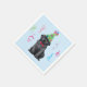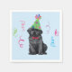 Grattis på födelsedagen hälsning med den här söta designen som har en jämn, party-hatt-slimmad Black Labrador Retriever-valp omgiven av färgstarka strömmare.