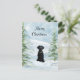 Den svart labaradorretrieveren sitter i snön mellan två julgranar som väntar för att vara den dekorerade helgdagvykortet