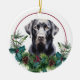 På framsidan av denna Helgdag är ornament ett vackert porträtt av en svart labrador Retriever-Hund som är inramad av en holly och en evig grön buske. Röda bär och gräs-koner dekorerar huggen och gräs sprickor. Bilden placeras på en vit cirkel inom en tunn röd linjekrets. Baksidan av dekoratet har samma vergreka och cirkel med anpassningsbarnas text i rött. Perfekt för alla som är "ägda" av en svart lab.
