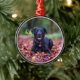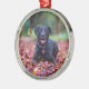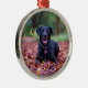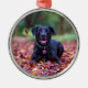 En svart labraducering som slår till bland bruna, gult och orange löv, med löv som faller genom luft