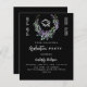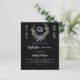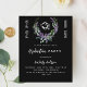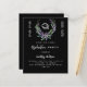 Svart bakgrund. En blomsterkrans gjord av lavendelblommor och akvarellfärgad eukalyptusgrönska. Anpassa och lägg till ett namn och detaljer. Vit text.