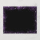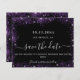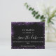 En modern och elegant Spara datum för ett bröllop. En svart bakgrund dekorerad med lila falskt glitter. gnistrar. Anpassa och lägg till ett datum och namn. Texten: Spara datum är skriven med en stor trendig handskriven stil.