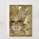 Elegant svart och guld maskerad inbjudan med vacker guldmask på en elegant guldbakgrund. Denna vackra svarta och gula maskerad inbjudan kan enkelt anpassas för ditt evenemang genom att helt enkelt lägga till dina evenemangsuppgifter, typsnitt, teckenstorlek och färg samt formulering. Detta är en tryckt design utan riktigt guld, folie, spets, glitter etc.