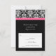 OSA kort för att matcha Elegantens svarta bakgrund med Fuchsia magenta shock rosa accent, bröllopsinbjudan. Färsk och elegant svart bakgrund med svart och vit fuktad accent och färgad vågräts dekorremsor. Anpassa onlinen med bröllop-informationen.