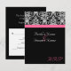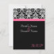 RSVP-kort för att matcha vår Eleganta svarta bakgrund med fuchsia magenta varmt rosa accent, bröllopsinbjudan. Fräsch och elegant svart bakgrund med svart och vit damaskaccent, och färgad horisontell accentlist. Anpassa online med dina bröllopsdetaljer.
