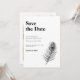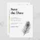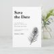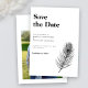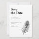 Inbjudan till Bröllop spara datum med minimal utformning ger en illustration av elegantens pjäsdukkonst i ett klassiskt svart-vitt färg tema. Den här Spara datuminbjudan är ett redo för dig att anpassa dig med informationen om din speciella dag och lägga till ett eget foto. Bläddra bland Black Peacock Feather Bröllop Suite för matchande artiklar i ett ständigt växande sortiment av papper.