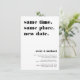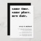 Måste du skjuta upp eller schemalägga om bröllop? Låt gästerna veta med dessa moderna och ljusa kort i vitt med svarta bokstäver. Lustigt och smart typografibaserad design har "samma tid, samma ställe, nytt datum" överst med ditt nya bröllop-datum och detaljer under.