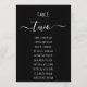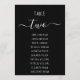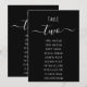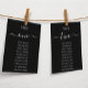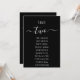 I den övre delen står bordnumret skrivet med handskrift och ordet Bord ovanför, med mindre versaler (handskrivna bokstäver). Under dem finns de 10 gästnamnen, i liknande handskrivna bokstäver. Bakgrunden är svart, all text är vit.