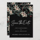 Vacker och elegant kalligrafi stavas Spara datum i vitt skript. Det sticker ut mot den mörka svarta bakgrunden. Vackra vita vinterblommor är boende i mörkgrön lövverk och röda bär.