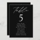 Elegant bröllop-sätesdiagram med "bord" som visas i ett vitt kalligrafiskt skript med bordsnummer och gäst namn som visas nedan på en svart bakgrund med subtila vita fläckar. Utformningen upprepas på baksidan. Om du vill beställa bordsnumrets sittande diagram redigerar du varje kort med bordsnumret och gäst namn och lägger till det i kundvagnen. Designad att samordna med vår moderna elegance bröllop-samling.