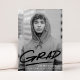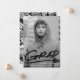 Modern examensannonsering med examenkandidatens vertikala foto med "Grad" i svarta handskrivna bokstäver och ett streck under. Anpassa den trendiga fotobaserade examensannonseringen genom att lägga till examenkandidatens namn, skolans namn och examensår. Annonseringen har en baksida med ett mönster av svarta och vita streckade penseldrag.