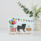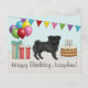 Desteis originaltecknade illustration av en söt svart pälsfärgad Mops-ras hund. Hunden är placerad i en färgglad födelsedagsmiljö. Det finns en födelsedagstårta med några ljus på, färgglada födelsedagsballonger och en flaggbanner samt två presentlådor. Det finns också ett personligt textfält.