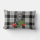 Grå färg- och svartplädbakgrund med en förtjusande svart mopsvalpsitta vid en gräsgren med en röd trädprydnad. En perfekt helgdaggåva för mopsälskare eller att ljusna upp din hund som älskar helgdagdekoren,
