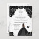 Denna eleganta och glamourösa födelsedagsfestinbjudan har en vacker prinsessa med mörk hy i en svart balklänning. Texten kombinerar handskriven skrift och moderna sans serif-teckensnitt för en klassisk och sofistikerad look. Blomsterarrangemangen, fjärilen och silverkonfetti skapar den perfekta blandningen av rustik och chic.