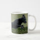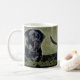 Den populära svart Labrador retrieveren presenteras på denna mugg med avelnamn och kamouflagebakgrund.
