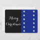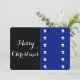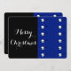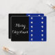 Julkort med Jultomten i sitt glansilhuetter i blå botten och texten: "God jul på en svart bakgrund med anpassade namn.