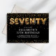 Modern 70-årsinbjudan med en svart bakgrund i snyggten, en spridning av guld konetti, guld hellium-ballonger som stavar "sjuttio" och en textmall i elegant party som är enkel att anpassa.