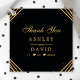 Visa er tacksamhet till gästerna med den här eleganten svart och guld geometriska bröllop tack märkrna. Den moderna designen har en svart bakgrund i chicen med abstrakt guld geometriskt linjer och en sprinkl av guld damm för en glamorbete. Anpassa märkrna med namn och bröllop-datumet för en unik och minnesvärd keepé. Perfekt för modernt bröllop, receptioner och repetitionsmiddagar.